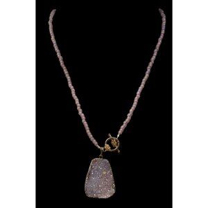 This enchanting necklace features a whimsical fairycore design, highlighted by a stunning purple druzy pendant and frosted glass beads. Ideal for adding a mystical touch to any outfit.