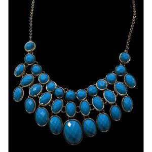 Elevate your style with this whimsical fantasy bib necklace. Featuring faceted blue gems, it's perfect for adding a touch of magic to any outfit. Lightweight and comfortable, it's a statement piece that complements any look.