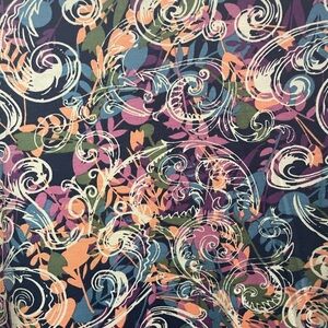 This Lularoe Perfect T is a great everyday shirt. It's a whimsical floral pattern in muted colors of orange, pink, purple, green, and blue, with an cream scroll pattern overtop. It has a good amount of stretch.