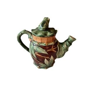 Dive into a delightful cuppa with this whimsical and unique ceramic teapot! Featuring a charming frog finial perched atop a lush lily pad lid, this piece is a true standout. The body of the pot showcases rich, earthy brown tones embraced by beautifully molded green bamboo stalks and cascading leaves, giving it an unmistakable cottagecore or jungalow aesthetic.