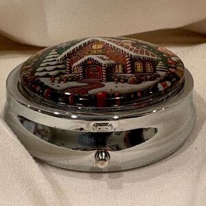Gorgeous travel size candy gingerbread house pill case with 3 compartments, use for medicine, vitamins. Anti-slip backing. Pocket or purse use, keep it in the car. Also has a mirror on inner lid. Made with durable metal outer shell that protects from scratches and crushed medicine keeps meds and supplements safe from damaging moisture and oxidation. Great little gifts for hostesses, teachers, stockings, etc. Comes with a velveteen pouch for gifting and storage. I ship fast usually within a business day!