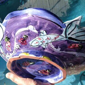 This is a FUN, Whimsical Hand Painted Swimming Fish Ceramic Pedestal Dish by Kate & Ryan. The piece is hand sculpted ceramic clay and has the outline of four swimming fish encircling the surface of the piece with their tails sculpted out creating part of the rim. There are rich and playful colors throughout the surface with free form shapes and curves that flow in a fluid movement. The design is painted and glazed on the inside and the outside of the piece and even on the underside of the piece with the artist signatures as well.