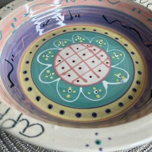 Whimsical Handmade Pottery Pie Deep Dish Plate Pan Hand Painted Apple Peach Pumpkin Lemon Meringue.