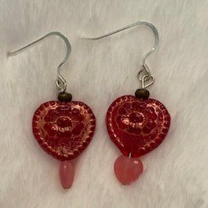 These beautiful handcrafted pink heart dangle earrings are perfect for any occasion! Czech glass red heart with copper glaze with a light pink drop bead at the bottom. Dress up or casual. Perfect gift for Valentines, Mother’s Day or birthday or just because!