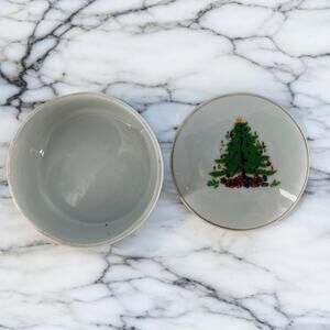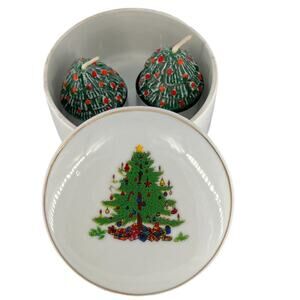 Charming trinket dish/box with lid. Lid features a festive Christmas tree design with presents and a decorative gold line around the edge. Also included are two small Christmas tree shaped tea light candles that fit neatly in the trinket box. No idea what the dish is made of. Due to light & screen variations, colors may vary slightly from the images