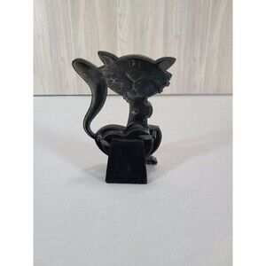 Stylized metal cat with exaggerated features and curled tail