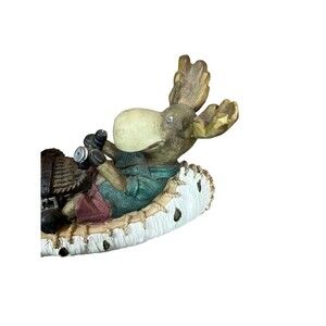 lodge decor, fishing figurine, novelty decor, rustic moose, birch canoe, humorous animal statue, woodland animals, cabin shelf sitter, whimsical collectible