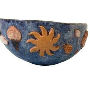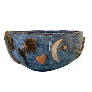 This charming blue pottery bowl features raised childlike motifs including balloons, flowers, and a smiling sun. Ideal for decorative or functional use.