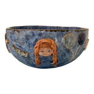 Whimsical Naive Blue Pottery Bowl Faces Mouse Rabbit Tree Balloons Sun And Moon