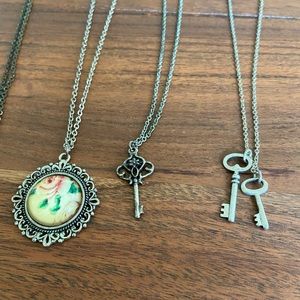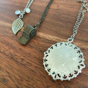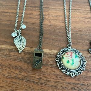 5 whimsical necklaces. All of the necklaces are in silver, except for the whistle which is a bronze color. It is not a working whistle. Good condition