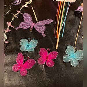 Whimsical Party Decor includes: Handmade Rainbow Wand, 5 Purple Mini Pinwheels, 5 Paper Lanterns, 6 Strands of Paper Mache Butterflies, 5 Sheer Butterflies, and 3 Paper Mache Balls- used for bday decor