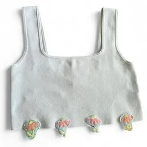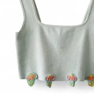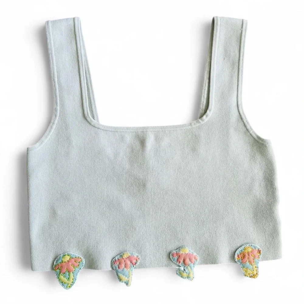 We added whimsical, handmade floral patches along the bottom hem, creating a fairy-style look that’s playful and one of a kind. The ribbed knit gives it structure while keeping it breathable and easy to move in.
