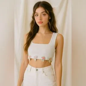 This reworked cropped tank started as an H&M piece and has been transformed into a unique, handmade top. The fabric is a soft ribbed knit with a lot of stretch, making it super comfortable and flattering. It fits best for sizes Small–Medium thanks to the stretch in the material.