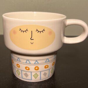 This whimsical, serene face mug is sure to bring smiles. Both sides feature a rosy cheeked face with long eyelashes over closed eyes. A multicolored repeated geometric design circles the elongated neck of the mug. Can be used as a coffee or tea cup, flower pot or planter (imagine it with a curly head of thyme), or for holding a bouquet of flowers, kitchen utensils, or pens and markers.