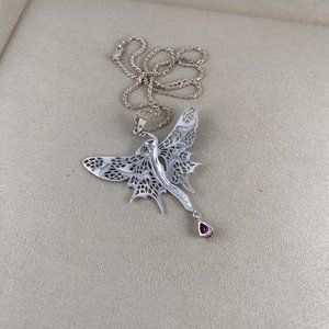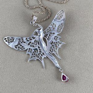Whimsical Sterling Silver Faerie (Fairy) with Blood Red Ruby Drop Necklace