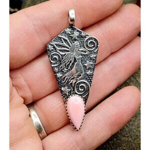 Embrace your boho spirit with this unique artisan fairy pendant necklace, featuring a pink conch shell set in sterling silver. Perfect for adding a whimsical touch to any outfit.