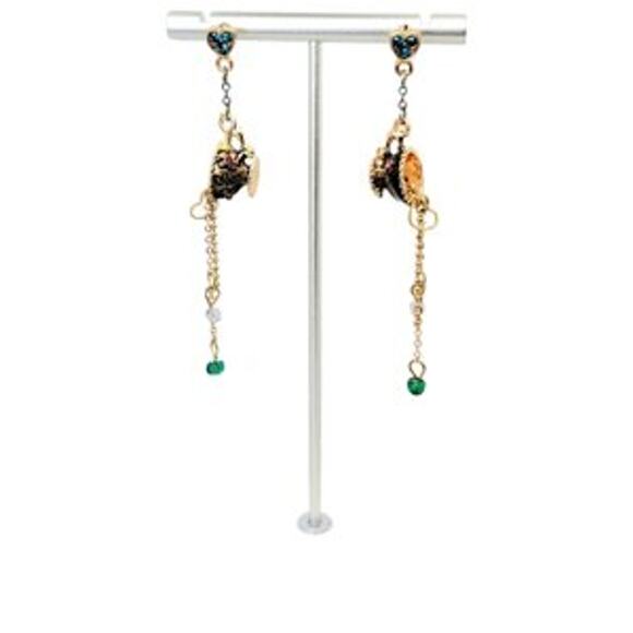 Whimsical Sparkling Painted Enamel Mult-Color Tea Cup on Gold Tone with Gunmetal Chains, Tea Cup spilling Crystals, chains and hearts full of love. Many colors spilling down 3" drop. Pierced post earrings with rubber stopper backs.