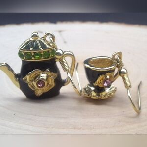Step into storybook charm with these adorable mismatched earrings—one a dainty black enamel teapot, the other a matching teacup and saucer. Accented with golden trim, sparkling green and pink rhinestones, and intricate floral detailing, these earrings bring a touch of vintage whimsy to any outfit.