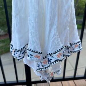 Adorable strappy white romper with colorful floral embroidery, structured bust cups, and a fluttery hem. Built-in bustier-style bodice with multi-strap back detail and breezy, lightweight fabric — perfect for summer parties, vacay pics, or festival season.