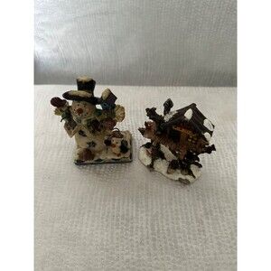 Whimsical snowman and penguin figurine and WinteryTree house figurine, 4”, resin