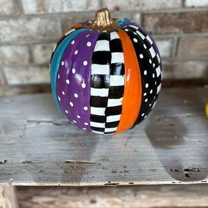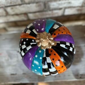 Whimsically hand painted pumpkin in bright colors, polka dots, checks and stripes. You have a unique pumpkin wrapped in fall, Halloween and Mardi Gras. It has a shiny, gloss finish. Check my closet under Home for more designs. He measures 12” tall and 10” wide.