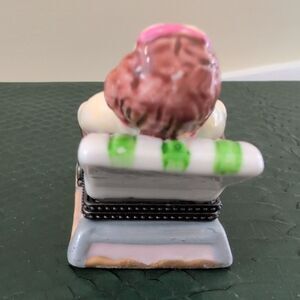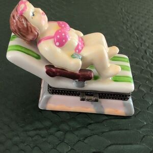 Charming figurine trinket box featuring a woman in a pink polka dot bikini holding a drink in her chaise lounge chair. Inside the trinket box is a pair of pink sunglasses. Perfect for small keepsakes.
