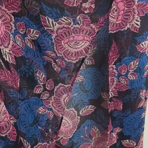 Like-new maxi dress with high elastic waist line, flounce ruffle top , belt loops (no belt or pockets). mini slip underneath leaving a semi-sheer lower half with long slit on one side. lightweight and flowy !