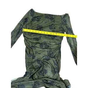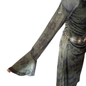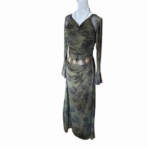 Whimsigoth Olive Floral Mesh Maxi Dress (M) — Ruched Waist, Bell Sleeves, Witchy 90s Vibes
