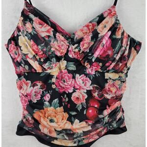 Whimsigoth Romantic Thong Contour Bodysuit XL Adjustable Straps VNeck Padded Rusch Black Mesh Colorful Floral