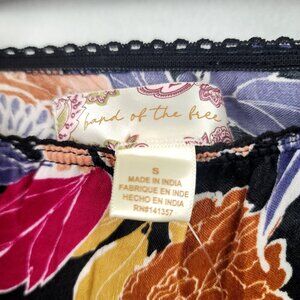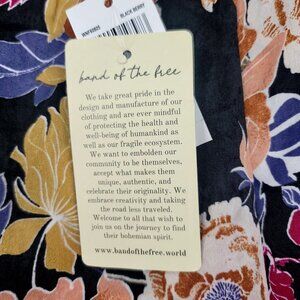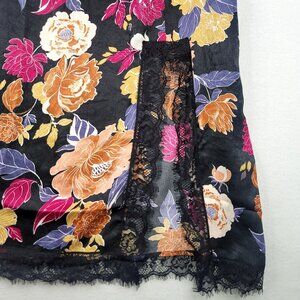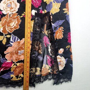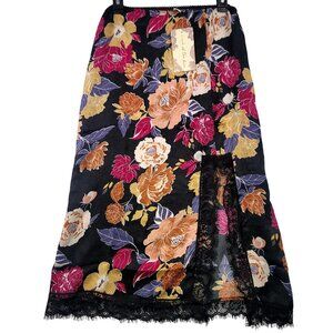 Keywords: floral midi skirt, lace trim skirt, bohemian skirt, black floral skirt, polyester skirt, Band Of The Free, elastic waist skirt, lightweight skirt, casual midi skirt, lace hem detail, boho fashion skirt, small size skirt, multicolor floral skirt, Boho, spring, concert, music festival, Satin, Slinky, Slip Skirt, Flowy, gypsy, romantic, new with tags