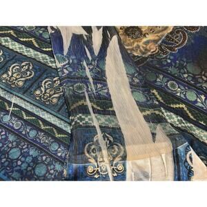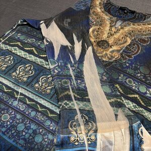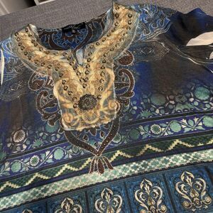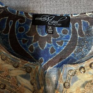 This Avenida Azul top is perfect for any occasion, whether you're traveling, going to a party, or just dressing casually for a day out. The V-neckline and pullover closure make it easy to wear, while the long sleeves and asymmetrical sleeve type provide a stylish and comfortable fit. The top is made of sheer polyester material with studded accents, making it a great addition to any outfit. The blouse is designed with a regular fit and is available in size 1X, making it perfect for plus-sized women. The top is packable, making it easy to carry with you wherever you go. With its boho, casual, and elegant style, this Avenida Azul top is a must-have for any fashion-conscious woman.
