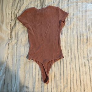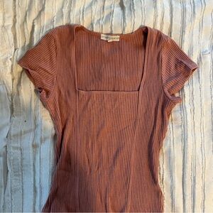 Chic ribbed top with a square neckline. Soft pink hue. Short sleeves for a casual look.