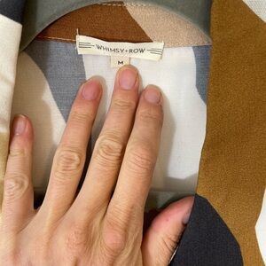 Gorgeous geometric print on this Whimsy Row long sleeve collared button-down maxi dress. Pretty neutrals excellent condition no flaws, size medium. Slits on either side with a tie at the waist. Fabric is light, soft and flowy
