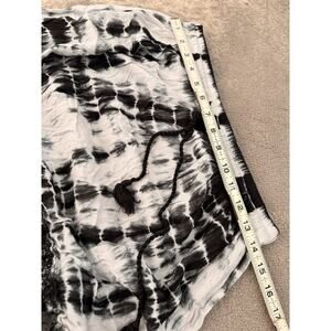 This bohemian skirt features a black and white tie-dye pattern, crochet accents, and tasseled details.