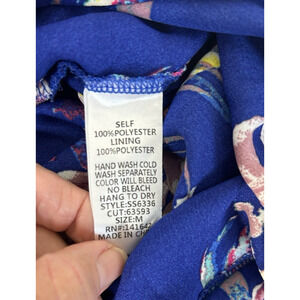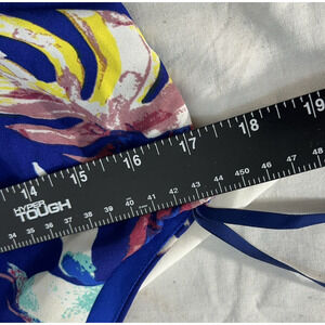 The She + Sky preowned women's royal blue romper features a ruched waist and open back design, perfect for a party or travel occasion. This sleeveless romper in size M is made of polyester blended fabric with a floral pattern and vibrant multicolor accents. The one-piece romper includes a pleated, button, and zipper detail, making it a stylish and trendy choice for any woman looking for a unique and chic outfit.