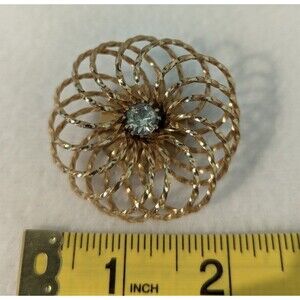 This vintage brooch looks like a spirograph helped in the design. Strong twisted gold tone wire creates the flower and a clear rhinestone center finishes the look. In very nice condition, just beautiful. Measurements are approximate: 2 inch diameter