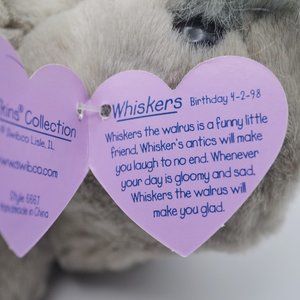 Whiskers the Walrus Puffkins is a all gray with white tusks Whiskers has brown eyes. Made by Swibco, this retired walrus Puffkin is style #6667 with a birthday of April 2, 1998.