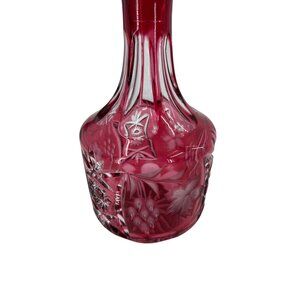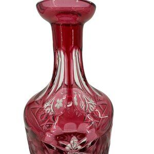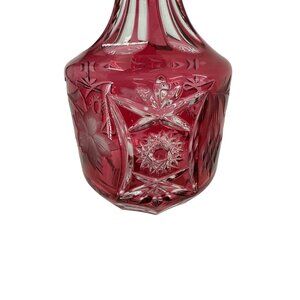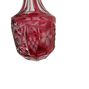 This elegant vintage decanter is crafted from ruby red cut glass, making it a sophisticated addition to any collection or interior decor. The intricate cut patterns enhance its beauty and the clear stopper adds a touch of refinement. Ideal for storing spirits or as a decorative piece.