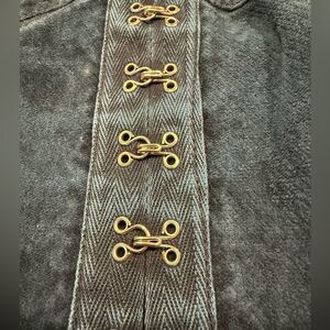 Material looks denim but it’s a soft/fuzzy type material. Material does have spandex so it has a little stretch. Straps are adjustable, zipper closure in back.