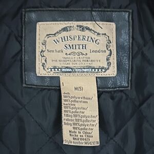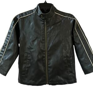 This is a Whispering Smith faux leather biker jacket for boys in size 5 Medium. It features a quilted lining, full zip closure, and is lined with 100% polyester. Designed for winter, fall, and spring seasons.