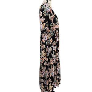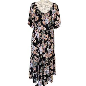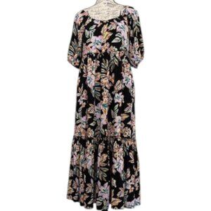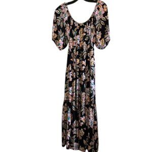 Flowy floral tiered maxi dress with ruffled waist and bottom. Has elastic neckline and can be worn loosely off the shoulder. Has balloon 1/2 sleeves. EUC!