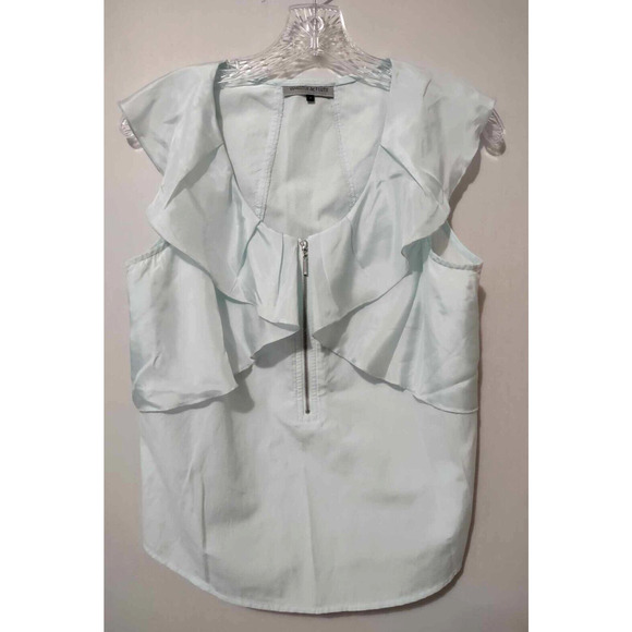 This Whistle & Flute mint green tank top is a playful addition to any wardrobe. It features delicate ruffle accents and a convenient zipper closure for easy wear. The size 4 top is designed for the modern woman and is perfect for any casual occasion. The brand is known for its high-quality clothing, and this tank top is no exception. The tank top is versatile enough to be dressed up or down. The Whistle & Flute mint ruffle zipper tank is a must-have for any fashion-forward individual.