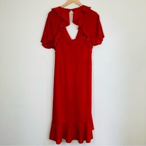 Abigail frill dress in red. Ruffle wrap front. Flutter sleeves. Open back with ruffle. By Whistles. Vibrant red color. Size and fabric content removed.