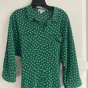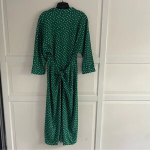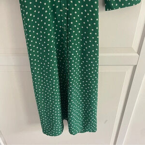 Whistles green with tan dots romper. Excellent used condition. The Selma silhouette has been refreshed with an of-the-moment spot print. Cut in a shirt shape, it comes with a cinched in waist, with long sleeves and a grown-up collar. Wear with everything from trainers to ankle boots this spring-summer. ·Collar ·Mid length · Colour: Green/Multi · Composition: 97% Polyester, 3% Elastane