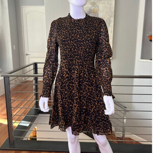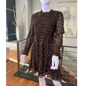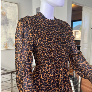 This NWT Whistles Classic Leopard Shirred Midi Dress is made from a responsibly sourced viscose blend and features chic shirring and frill details, a fitted silhouette with a flared bottom, shirred bodice and cuffs, a mock neck, and long sleeves.