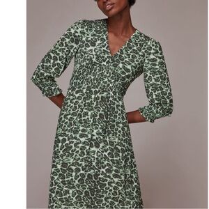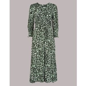 An uplifting timeless style, this dress has been adorned with an elegant cloud-like print in shades of green and white. The design features a flattering V-shaped neckline, shirring at the waist, and elbow-length sleeves. Add a pair of mules or white trainers depending on the occasion, and finish with your favourite jewellery to complete the look.