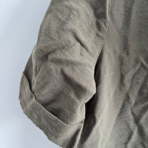 Linen dress in Army green color, buttons all the way down. Can also be worn as a duster on top of a tank, or as a buttoned-up dress.