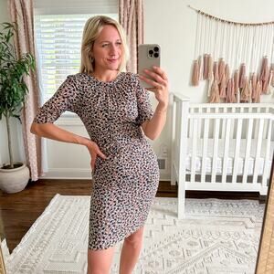 Details: Whistles Terrocotta Geometric Print Ruched Dress - Size: 4- Color: Brown- Material: 85% Silk, 15% Elastane - Features: Geometric print, 3/4 sleeve, round neck, pleated, ruched, lined, stretch, bodycon, zipper closure, knee length, comfort, breathable, casual.