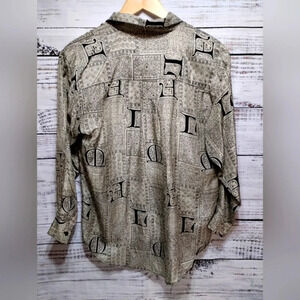 This stunning silk button-down top in a Gold/black color with symbols is a must-have addition to your wardrobe. With a 100 percent silk composition, it offers a luxurious feel and a flowy silhouette that is perfect for the warmer months. Measuring 21" from armpit to armpit and 29 inches in length, it is in very good condition and will effortlessly elevate any outfit.