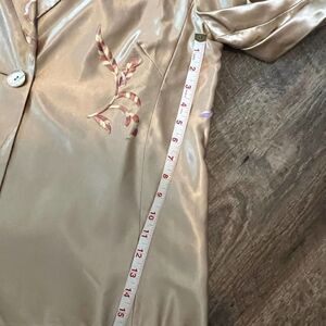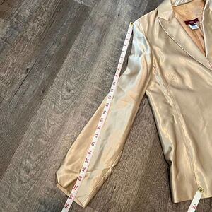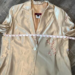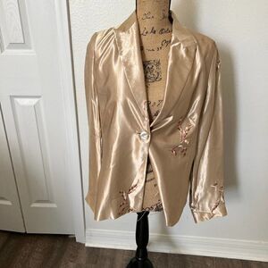 This listing g is for a Whistles Dressy Blazer in size 10. The blazer is a Golden Champagne color with beautiful floral embroidery. The blazer is lined, and in good condition. There is a small area on the black of the blazer where there is a little bit of pulling, please see photo.